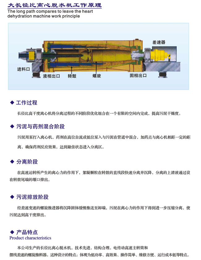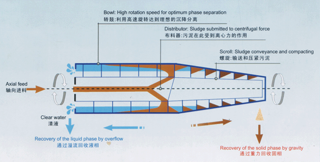 轉筒、螺旋推料器同向高速旋轉,轉筒、螺旋推料器在差速器作用下速差為10-30轉/分。分離原液經進料口進入高速轉動的轉筒內,在離心力的作用下液體中質量大的懸浮物迅速地向筒壁積聚。已分離的濾液由水層內圈之出水孔經出液口排出。沉渣由螺旋推料器推送到轉筒的圓錐端經出渣口排出。