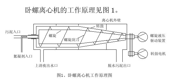 臥螺離心脫水機具有分離效果良好、工作效率高、使用管理維護簡單方便的特點,并且臥螺離心脫水機采用全封閉的結構,避免了帶式壓慮機存在的種種弊端(如現場環境惡劣、臭味大、大量使用絮凝劑和清洗水、設備體積大、日常使用維護麻煩),目前在污水處理、食品、醫藥、化工等領域的固液分離中得到廣泛的應用,本研究根據生產實踐,探索了速差、工作壓力等控制條件對污泥脫水效果影響的變化規律,總結了使離心機的穩定運行的調整方法。