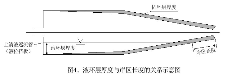 當進泥量一定時,如果液環層厚度較大,污泥在離心機內的停留時間長,污泥在液環層內進行分離的時間越長,會有更多的污泥被分離出來,并能夠降低某些小顆粒受擾動而隨分離液流失的可能性,但液環層厚度過大,會造成水隨脫水后的污泥從污泥出口溢出;如果離心機內的液環層厚度較小,污泥在離心機內的停留時間短,工作壓力不容易提高,但脫水后的污泥含水率也較低。綜合以上兩方面的作用,液環層增厚一般會提高脫水的固體回收率,但液環層增厚,相應會使岸區縮短,如上圖所示,使脫離液環層的污泥沒有充足的時間被甩干,因此泥餅含固率將下降。在控制液環層厚度時間應
