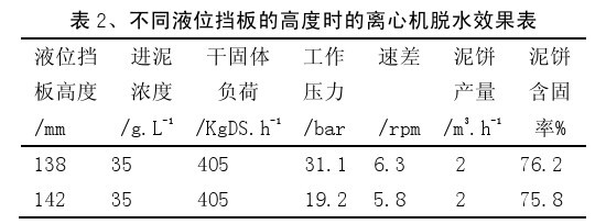 (6) 通過改變液位擋板的位置來調整離心機的液環層厚度,對離心機污泥脫水效果的影響非常大,必須通過反復的試驗,將液環層厚度設定在合適的水平,則可以保證污泥的含水率會降低,并且有較高的污泥產量;
