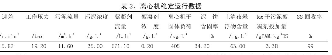 具體操作時,初始階段,按每公斤干污泥投加 6克 PAM 的投藥量,在保持絮凝劑投加量固定不變的前提下,通過調整污泥螺桿泵的轉速,按最大流量進泥,從低到高逐漸提高速差,直至上清也完全清澈,如果速差已經提高到 7 r/min 以上,上清液的懸浮物含量仍然較多,說明進泥量已超過離心機的最大干固體負荷,此時按 100%、90%、80%、70%、60%、50%、40%的梯度逐漸降低進泥流量,直到出現良好的上清夜;經過上述調整,待離心機運行穩定后,逐漸降低絮凝劑的投加量,直至在最少的 PAM 的投藥量情況下,都能獲得良好的泥餅含固率和上清液含固率為止。離心機穩定運行時的數據見表 3。