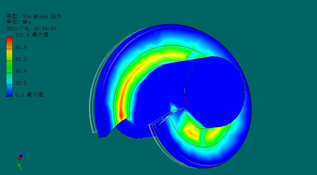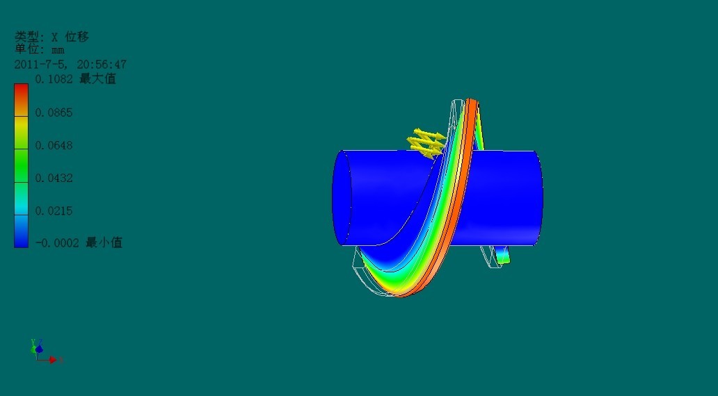 下面我們通過對螺旋葉片施加一定的載荷,來反映在工作狀態下螺旋葉片最大應力和變形發生的位置。下面我們從ANSYS有限元分析的結論圖中選定:Von Mises 應力(Von Mises 應力是基于剪切應變能的一種等效應力,其含義是單元體形狀比能達到一定的程度)和X方向上的位移這兩幅分析圖,既可以清楚反映葉片的根部應力值最大的問題,同時從位移圖中可以看出葉片外端部所受的位移變化之最大。