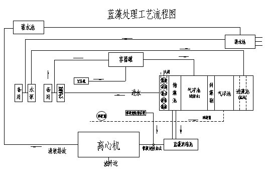 藍(lán)藻由水泵從湖面抽至進(jìn)藻池內(nèi),藻泥由進(jìn)藻池溢流到氣浮池,在氣浮池內(nèi)由空壓機(jī)泵入氣、水對(duì)氣浮池內(nèi)的藻泥進(jìn)行攪動(dòng)的同時(shí),另一條管線泵入助凝劑進(jìn)行助凝,經(jīng)過助凝和氣浮后的藻泥,由于比重較輕因此浮在池面上,這時(shí)通過刮藻刷把氣浮池表面堆積的藻泥刮到儲(chǔ)藻池,儲(chǔ)藻池內(nèi)上層藻泥溢流至藍(lán)藻濃縮池,下部水通過管路排出進(jìn)入容器罐,在藍(lán)藻濃縮池經(jīng)過濃縮后的藻泥通過與絮凝劑投加裝置輸送過來的絮凝劑進(jìn)行絮凝后進(jìn)入離心機(jī)進(jìn)行分離后,分離后的渣相外運(yùn),液相排入湖面。